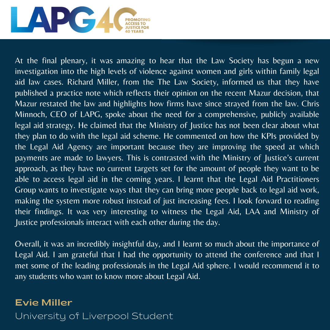 The cyber attack on the LAA’s IT systems has had profound impact on both legal aid providers and clients trying to access help and support. Over recent months, the LAA has introduced a range of contingency measures after deciding to take all of its digital systems offline to prevent. further attacks and improve system security. Chris Minnoch, CEO, LAPG and Richard Miller, Head of Justice, The Law Society discussed the state of play by the time of the conference, looking at issues such as ongoing contingency measures, the recoupment of the contingency payments made to providers, and compensating providers for the additional costs they incurred as a result of the data breach.